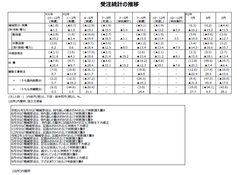 ●内閣府の基調判断の推移をみると、19年9月分では「機械受注は、持ち直しの動きに足踏みがみられる」という判断に下方修正された。その後10月分ではさらに下方修正され、18年12月分~19年3月分以来の「機械受注は、足踏みがみられる」という判断になった。11月分・12月分・20年1月分、2月分、3月分と、「機械受注は、足踏みがみられる」という判断であったが、新型コロナウイルス感染拡大の影響が大きく出た4月分では「機械受注は、足元は弱含んでいる」という判断に下方修正され、5月分では判断据え置きになった。6月分では「機械受注は、減少している」という判断に下方修正され、7月分では判断据え置きになった。前回8月分で「機械受注は、下げ止まりつつある」に上方修正され、今回9月分で据え置きになった。