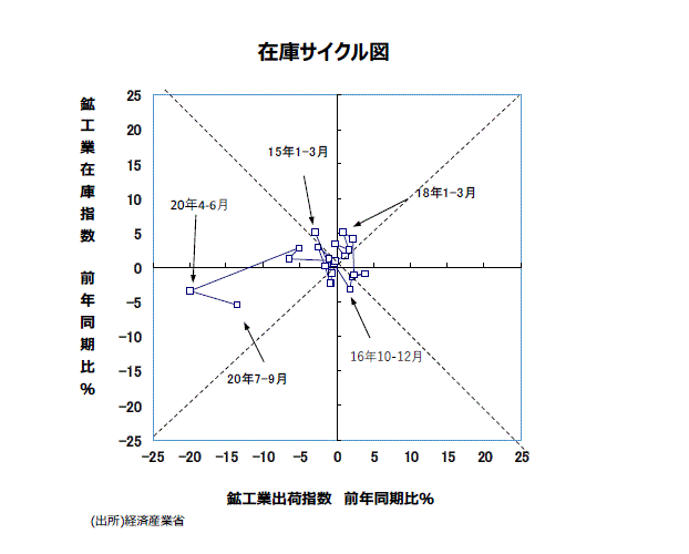 ●大きな動きをチェックするために、鉱工業全体で縦軸に在庫の前年比を、横軸に出荷の前年比をとった在庫サイクル図をつくると、17年10~12月期以降、45度線を上回って推移し、概ね「在庫積み上がり局面」が続いていた。19年10~12月期、出荷の前年同期比が▲6.5%、在庫が同+1.2%、20年1~3月期、出荷の前年同期比が▲5.2%、在庫が同+2.9%と、どちらも「在庫調整局面」であった。20年4~6月期は、出荷の前年同月比が▲19.9%、在庫が同▲3.4%と、出荷は大幅に減少したものの在庫調整がさらに進んだ。20年7~9月期は、出荷の前年同月比が▲13.5%、在庫が同▲5.5%と、引き続き「在庫調整局面」の状態にあるが、在庫調整は進みつつあると言えよう。