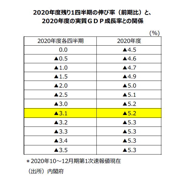 ●「令和3年度の経済見通し」の20年度実質GDP成長率実績見込み・前年度比▲5.2%を達成するには、20年度残り1四半期で前期比年率▲11.8%(前期比▲3.10%)が必要である。19年度から20年度へのゲタは▲1.3%である。なお、20年度残り1四半期が前期比0.0%だと20年度実質GDP成長率・前年度比は▲4.5%のマイナス成長になる。20年度残り1四半期が前期比▲2.0%だと20年度実質GDP成長率・前年度比は▲5.0%のマイナス成長になる。