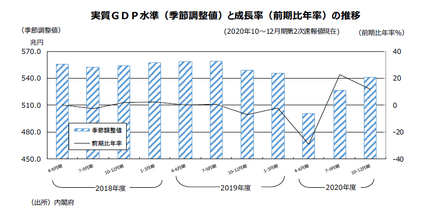 ●20年10~12月期実質GDP成長率・第2次速報値は前期比+2.8%、前期比年率+11.7%となり、第1次速報値の前期比前期比+3.0%、前期比年率+12.7%からやや下方修正となった。新型コロナウイルスの感染拡大により経済活動が停滞した4~6月期から大きく持ち直した7~9月期に続いて2四半期連続の2桁のプラス成長であることに変わりはなかった。法人企業統計などを受けて修正された。