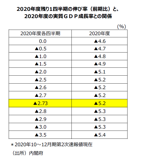 ●「令和3年度の経済見通し」の20年度実質GDP成長率実績見込み・前年度比▲5.2%を達成するには、20年度残り1四半期で前期比年率▲10.5%(前期比▲2.73%)が必要である。19年度から20年度へのゲタは▲1.3%である。なお、20年度残り1四半期の1~3月期は緊急事態宣言再発出されたためマイナス成長が見込まれている。1~3月期が前期比▲2.0%だと20年度実質GDP成長率・前年度比は▲5.1%のマイナス成長になる。前期比▲1.0%だと20年度実質GDP成長率・前年度比は▲4.8%のマイナス成長になる。仮に前期比0.0%だと20年度実質GDP成長率・前年度比は▲4.6%のマイナス成長になる。