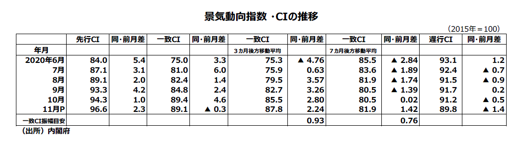 -先行CI前月差+2.3で6カ月連続上昇、一致CIは▲0.3と6カ月ぶり下降-