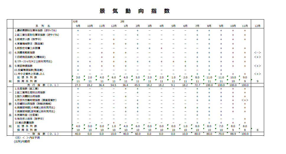 ●11月分の先行DIは100.0%と5カ月連続、景気判断の分岐点の50%を上回った。速報値からデータが利用可能な9系列中、最終需要財在庫率指数、鉱工業生産財在庫率指数、新規求人数、新設住宅着工床面積、消費者態度指数、日経商品指数、マネーストック、東証株価指数、中小企業売上げ見通しDIの全系列がプラス符号になった。