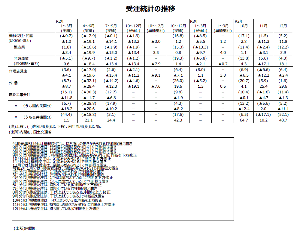 ●内閣府の基調判断の推移をみると、19年10月分から20年3月分まで半年にわたり「機械受注は、足踏みがみられる」という判断であったが、新型コロナウイルス感染拡大の影響が大きく出た4月分では「機械受注は、足元は弱含んでいる」という判断に下方修正され、5月分では判断据え置きになった。6月分では「機械受注は、減少している」という判断にさらに下方修正され、7月分では判断据え置きになった。8月分で「機械受注は、下げ止まりつつある」に上方修正され、9月分でも据え置きになった。10月分で「下げ止まっている」に上方修正となったあと、前回11月分で「持ち直しの動きがみられる」に2カ月連続で上方修正となった。今回12月分では「持ち直している」に3カ月連続で上方修正となった。機械受注(除船電民需)の前月比が3カ月連続増加したことと、3カ月移動平均が4カ月連続増加したことなどを反映しているようだ。