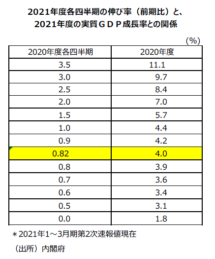 ●「令和3年度の経済見通し」の21年度実質GDP成長率見通し・前年度比+4.0%を達成するには、21年度各四半期、前期比年率+3.4%(前期比+0.82%)が必要である。20年度から21年度へのゲタは+1.8%である。なお、21年度各四半期が前期比+0.5%だと21年度実質GDP成長率・前年度比は+3.1%になる。