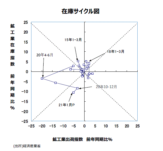 ●大きな動きをチェックするために、鉱工業全体で縦軸に在庫の前年比を、横軸に出荷の前年比をとった在庫サイクル図をつくると、17年10~12月期以降、45度線を上回って推移し、概ね「在庫積み上がり局面」が続いていた。19年10~12月期、出荷の前年同期比が▲6.5%、在庫が同+1.2%、20年1~3月期、出荷の前年同期比が▲5.2%、在庫が同+2.9%と、どちらも「在庫調整局面」であった。20年4~6月期は、出荷の前年同月比が▲19.9%、在庫が同▲3.4%と、出荷は大幅に減少したものの在庫調整がさらに進んだ。20年7~9月期は、出荷の前年同期比が▲13.5%、在庫が同▲5.7%と、引き続き「在庫調整局面」の状態にあったが、10~12月分では出荷の前年同月比が▲3.3%、在庫が同▲8.4%、そして21年1月分では出荷の前年同月比が▲5.1%、在庫が同▲10.5%と、20年4~6月期以降在庫が減少する中で、在庫調整がかなり進んで「意図せざる在庫減局面」になっている。