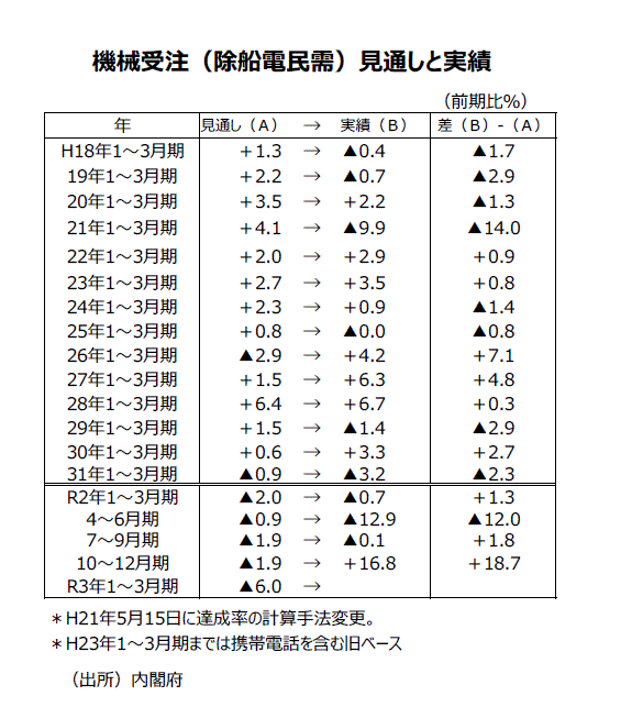 ●内閣府の基調判断の推移をみると、19年10月分から20年3月分まで半年にわたり「機械受注は、足踏みがみられる」という判断であったが、新型コロナウイルス感染拡大の影響が大きく出た4月分では「機械受注は、足元は弱含んでいる」という判断に下方修正され、5月分では判断据え置きになった。6月分では「機械受注は、減少している」という判断にさらに下方修正され、7月分では判断据え置きになった。8月分で「機械受注は、下げ止まりつつある」に上方修正され、9月分でも据え置きになった。10月分で「下げ止まっている」に上方修正となったあと、11月分で「持ち直しの動きがみられる」に上方修正、12月分では「持ち直している」に3カ月連続で上方修正となった。前回21年1月分では「持ち直している」で判断据え置きになった。今回2月分では「持ち直しの動きに足踏みがみられる」に判断が下方修正された。機械受注(除船電民需)の3カ月移動平均が6カ月ぶりに減少したことなどを反映しているようだ。