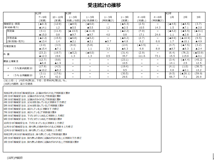 ●内閣府の基調判断の推移をみると、19年10月分から20年3月分まで半年にわたり「機械受注は、足踏みがみられる」という判断であったが、新型コロナウイルス感染拡大の影響が大きく出た4月分では「機械受注は、足元は弱含んでいる」という判断に下方修正され、5月分では判断据え置きになった。6月分では「機械受注は、減少している」という判断にさらに下方修正され、7月分では判断据え置きになった。8月分で「機械受注は、下げ止まりつつある」に上方修正され、9月分でも据え置きになった。10月分で「下げ止まっている」に上方修正となったあと、11月分で「持ち直しの動きがみられる」に上方修正、12月分では「持ち直している」に3カ月連続で上方修正となった。21年1月分では「持ち直している」で判断据え置きになった。前回2月分では「持ち直しの動きに足踏みがみられる」に判断が下方修正され、今回3月分でも「持ち直しの動きに足踏みがみられる」と据え置かれた。機械受注(除船電民需)の3カ月移動平均が2カ月連続減少になったことなどを反映しているようだ。