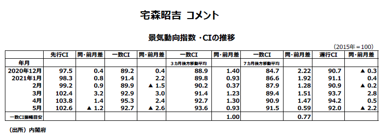 ●5月分は一致CIの前月差が下降でも、3カ月後方移動平均は前月差0.93ポイント上昇し11カ月連続して上昇したので、一致CIを使った景気の基調判断は「改善」継続となった。コロナ禍でも、輸出、生産の底堅さなどから景気の基調はしっかりしていることを示唆しよう。なお、景気拡張の動きが足踏み状態になっている可能性が高いことを示す「足踏み」に下方修正される条件は「3カ月後方移動平均(前月差)の符号がマイナスに変化し、マイナス幅(1カ月、2カ月、または3カ月の累計)が1標準偏差分以上 かつ 当月の前月差の符号がマイナス」になることである。