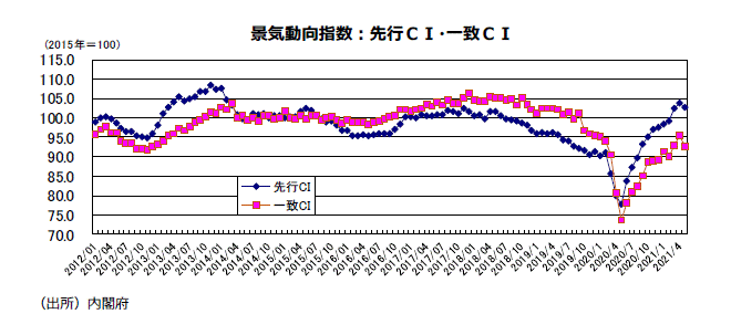 ●最近の、一致CIを使った景気の基調判断をみると、19年8月分~20年7月分は「悪化」の判断だったが、景気の基調判断は8月分で19年5月分~7月分以来13カ月ぶりの「下げ止まり」に上方修正された。その後、20年9月分から12月分まで「下げ止まり」で同じ判断が継続した。21年1月分で一致CIを使った景気の基調判断が、事後的に判定される景気の谷が、それ以前の数カ月にあった可能性が高いことを示す「上方への局面変化」に上方修正され、2月分では判断が据え置かれた。3月分で景気拡張の可能性が高いことを示す「改善」に、「上方への局面変化」から上方修正され、前回4月分では判断据え置きになった。
