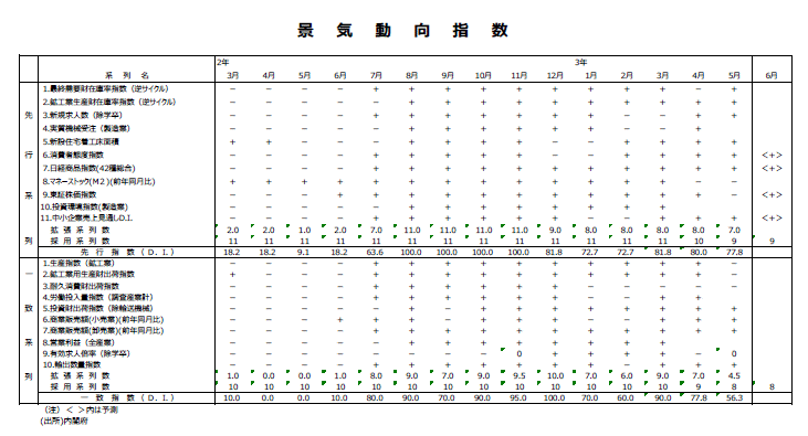●5月分の先行DIは77.8%と景気判断の分岐点の50%を11カ月連続で上回った。速報値からデータが利用可能な9系列中、最終需要財在庫率指数(逆サイクル)、鉱工業生産財在庫率指数(逆サイクル) 、新規求人数、新設住宅着工床面積、消費者態度指数、日経商品指数、中小企業売上げ見通しDIの7系列がプラス符号に、マネーストック、東証株価指数の2系列がマイナス符号になった。