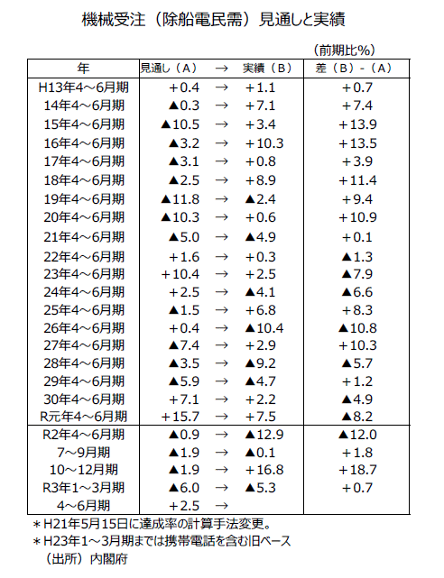 ●機械受注(除船電民需)の4~6月期・前期比実績は09年(平成21年)から昨年までの12年間でみると、上振れ4回、下振れ8回であり、下振れしやすい傾向がある四半期である。しかし、今年は上振れになる可能性が大きくなった。4~6月期の見通しは単純集計値に過去3四半期平均の達成率96.7%をかけたものである。4~6月期の前期比見通しの+2.5%を達成するためには、6月分で前月比▲7.4%以上が必要である。また、6月分前月比が0.0%なら4~6月期の前期比は+5.2%に上振れることになる。