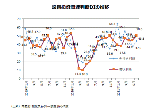 ●景気ウォッチャー調査の設備投資関連・DIは、20年1月の現状判断DIが52.8(回答数9人)と18年12月分の55.0以来の50超であった。当時の設備投資関連・現状判断DIからは底堅さが感じ取れるようになっていた。しかし、新型コロナウイルスの影響で現状判断DIは4月10.0(同5人)へと急落した。4月を底に多少の上下はあったものの11月は50.0(同13人)まで持ち直した。しかし、その後は新型コロナウイルス感染状況に翻弄されるように、12月は44.4(同9人)、21年1月は39.3(同7人)、2月は37.5(同14人)と低下したあと、3月は47.5(同10人)に戻り、4月は44.4(同9人)、5月は45.0(同5人)、6月は50.0(同7人)に戻っている。6月では5月に続き、「客の設備投資意欲に変化はみられない。」という同じコメントをする景気ウォッチャー(東北・通信会社(営業担当))がいた。
