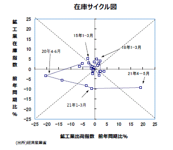 ●鉱工業全体の在庫循環の動きをチェックするために、縦軸に鉱工業在庫指数・前年比、横軸に鉱工業出荷指数・前年比をとった在庫サイクル図をつくると、20年7~9月期までは「在庫調整局面」の状態にあったが、20年10~12月期、21年1~3月期では「意図せざる在庫減局面」になっていた。4~5月分では在庫の前年同月比▲9.3%、出荷が前年の反動もあり、前年同月比+19.1%と2ケタの伸び率になり、「在庫積み増し局面」に入った。
