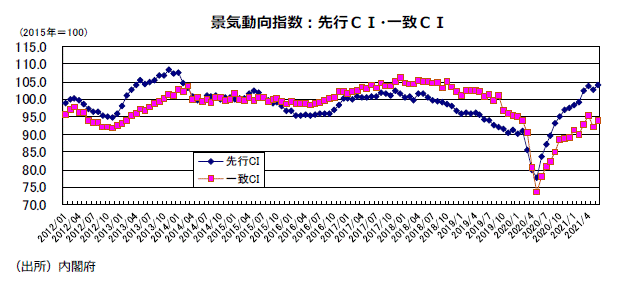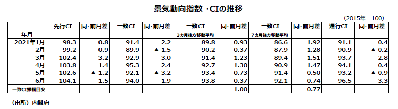 ●最近の、一致CIを使った景気の基調判断をみると、19年8月分~20年7月分は「悪化」の判断だったが、景気の基調判断は8月分で19年5月分~7月分以来13カ月ぶりの「下げ止まり」に上方修正された。その後、20年9月分から12月分まで「下げ止まり」で同じ判断が継続した。21年1月分で一致CIを使った景気の基調判断が、事後的に判定される景気の谷が、それ以前の数カ月にあった可能性が高いことを示す「上方への局面変化」に上方修正され、2月分では判断が据え置かれた。3月分で景気拡張の可能性が高いことを示す「改善」に、「上方への局面変化」から上方修正され、4月分・5月分と判断据え置きになっていた。
