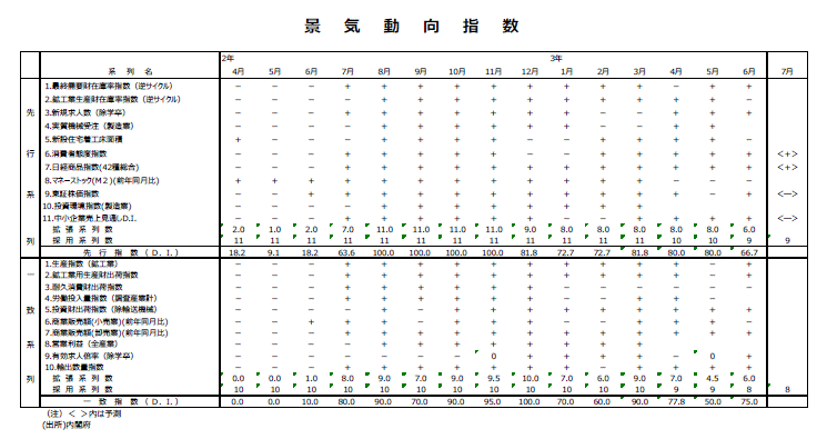 ●また、7月分の先行DIでは、数値が判明している消費者態度指数、日経商品指数、東証株価指数、中小企業売上げ見通しDIの4系列では、消費者態度指数、日経商品指数の2系列がプラス符号に、東証株価指数、中小企業売上げ見通しDIの2系列がマイナス符号になることが判明している。7月分速報値段階の先行DIは22.2%以上77.8%以下になることが確定している。