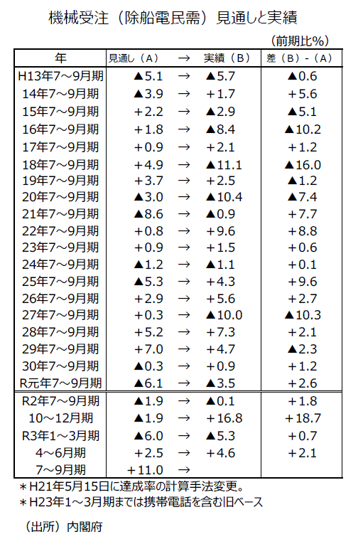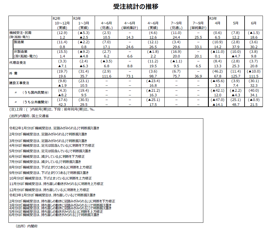 ●21年1月分では「持ち直している」で内閣府の基調判断は据え置きであった。2月分では「持ち直しの動きに足踏みがみられる」に判断が下方修正され、3月分・4月分でも同じ判断だった。前回5月分で「持ち直しの動きがみられる」に上方修正され、今回6月分で据え置きとなった。機械受注(除船電民需)の3カ月移動平均が2カ月連続増加になったことなどを反映しているようだ。