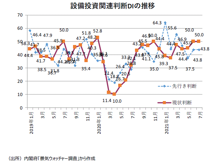 ●景気ウォッチャー調査の設備投資関連・DIは、20年1月の現状判断DIが52.8(回答数9人)と18年12月分の55.0以来の50超であった。当時の設備投資関連・現状判断DIからは底堅さが感じ取れるようになっていた。しかし、新型コロナウイルスの影響で現状判断DIは4月10.0(同5人)へと急落した。4月を底に多少の上下はあったものの11月は50.0(同13人)まで持ち直した。しかし、その後は新型コロナウイルス感染状況に翻弄されるように、12月は44.4(同9人)、21年1月は39.3(同7人)、2月は37.5(同14人)と低下したあと、3月は47.5(同10人)に戻り、4月は44.4(同9人)、5月は45.0(同5人)、6月は50.0(同7人)、7月は50.0(同7人)に戻っている。7月では前月に続き、「客の設備投資意欲に変化はみられない。」という同じコメントをする景気ウォッチャー(東北・通信会社(営業担当))がいた。