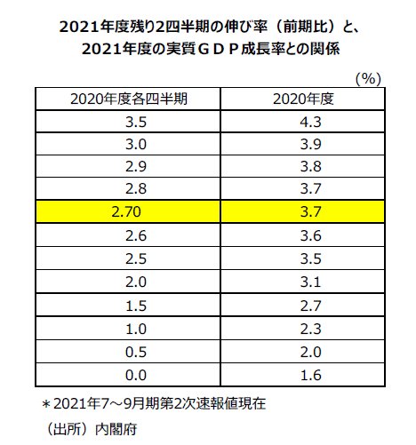 ●「令和3年度の内閣府年央試算」の21年度実質GDP成長率見通し・前年度比+3.7%を達成するには、21年度残り2四半期で各々前期比年率+11.3%(前期比+2.70%)が必要であるので、達成は難しいだろう。20年度から21年度へのゲタは+1.8%である。なお、21年度残り2四半期が前期比+1.0%だと21年度実質GDP成長率・前年度比は+2.3%になる。21年度各四半期が前期比+2.0%だと21年度実質GDP成長率・前年度比は+3.1%になる。