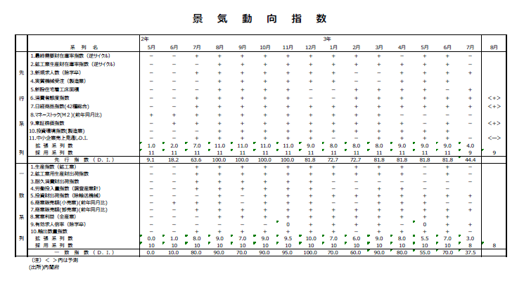 ●また、8月分の先行DIでは、数値が判明している消費者態度指数、日経商品指数、東証株価指数、中小企業売上げ見通しDIの4系列では、消費者態度指数、日経商品指数、東証株価指数の3系列がプラス符号に、中小企業売上げ見通しDIの1系列がマイナス符号になることが判明している。8月分速報値段階の先行DIは33.3%以上88.9%以下になることが確定している。