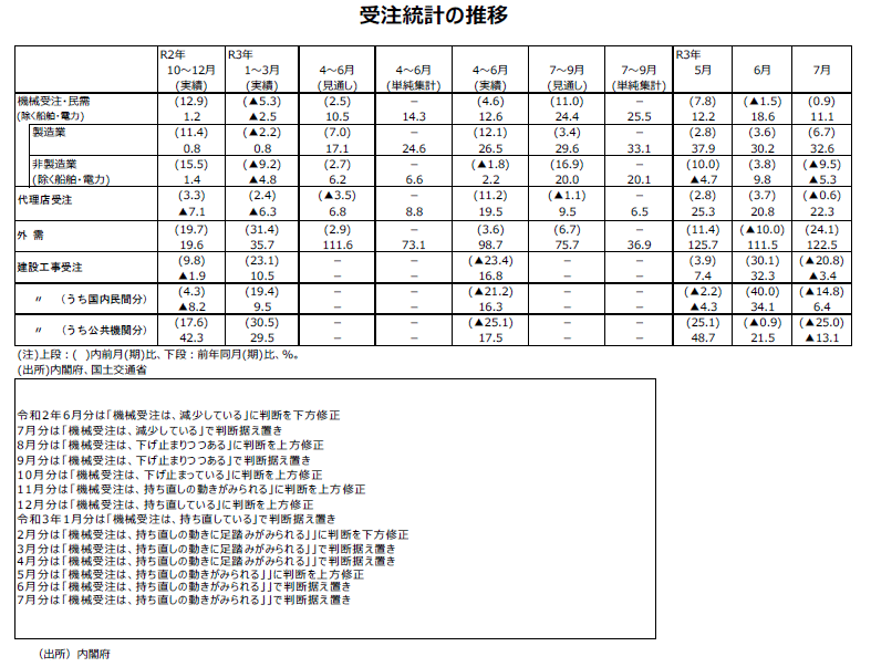 ●21年1月分では「持ち直している」で内閣府の基調判断は据え置きであった。2月分では「持ち直しの動きに足踏みがみられる」に判断が下方修正され、3月分・4月分でも同じ判断だった。5月分で「持ち直しの動きがみられる」に上方修正され、前回6月分に続き今回7月分でも据え置きとなった。機械受注(除船電民需)の前月比が+0.9%の増加、そして3カ月移動平均が3カ月連続増加しているが、一方で非製造業が前月比マイナスに転じたことなど、総合的に判断しているようだ。