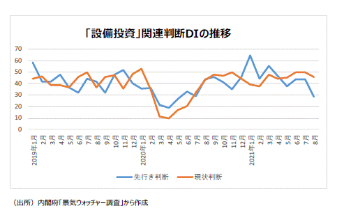 ●景気ウォッチャー調査の設備投資関連・DIは、20年1月の現状判断DIが52.8(回答数9人)と景気判断の分岐点50を上回り底堅さが感じ取れる感じだったが、20年4月に新型コロナウイルスの影響で現状判断DIが10.0(同5人)へと急落した。4月を底に多少の上下はあったものの11月は50.0(同13人)まで持ち直した。しかし、その後は新型コロナウイルス感染状況に翻弄されるように、21年2月に37.5(同14人)と低下した。その後、21年3月47.5(同10人)、4月44.4(同9人)、5月45.0(同5人)、6月50.0(同7人)、7月50.0(同7人)、8月45.8(同6人)と推移している。8月では「緊急事態宣言が発出されたが、各企業も大きな動きはなく営業活動を行い、設備投資に関しても問題なく計画されている。」というコメントをする景気ウォッチャー(九州・その他サービス業[物品リース](職員))がいた。