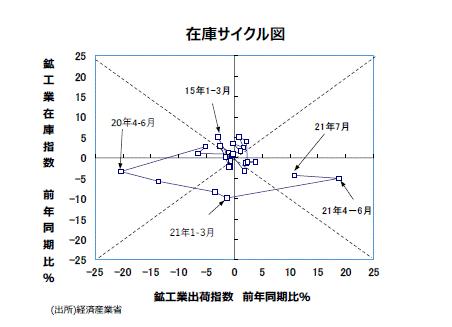 ●鉱工業全体の在庫循環の動きをチェックするために、縦軸に鉱工業在庫指数・前年比、横軸に鉱工業出荷指数・前年比をとった在庫サイクル図をつくると、20年7~9月期までは「在庫調整局面」の状態にあったが、20年10~12月期、21年1~3月期では「意図せざる在庫減局面」になっていた。4~6月期では在庫の前年同月比▲4.8%、出荷が前年の反動もあり、前年同月比+18.7%と2ケタの伸び率になり、「在庫積み増し局面」に入った。7月分では在庫が前年同月比▲4.3%、出荷が前年同月比+10.8%の伸び率になり、引き続き「在庫積み増し局面」となっている。