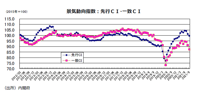 -先行CI前月差▲1.6の3カ月連続の下降、一致CI▲3.8と3カ月連続の下降-