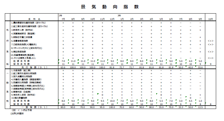 ●また、10月分の先行DIでは、数値が判明している消費者態度指数、日経商品指数、東証株価指数、中小企業売上げ見通しDIの4系列では、消費者態度指数、日経商品指数、東証株価指数の3系列がプラス符号に、中小企業売上げ見通しDIの1系列がマイナス符号になることが判明している。10月分速報値段階の先行DIは33.3%以上88.9%以下になることが確定している。