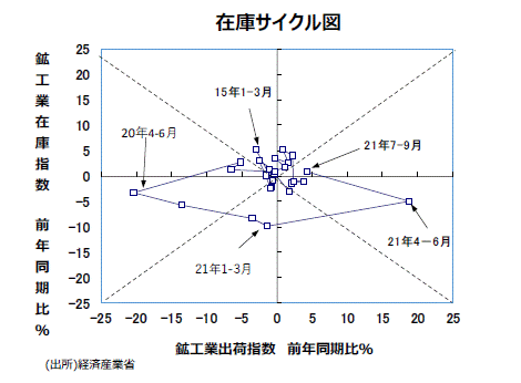 ●鉱工業全体の在庫循環の動きをチェックするために、縦軸に鉱工業在庫指数・前年比、横軸に鉱工業出荷指数・前年比をとった在庫サイクル図をつくると、20年7~9月期までは「在庫調整局面」の状態にあったが、20年10~12月期、21年1~3月期では「意図せざる在庫減局面」になっていた。4~6月期では在庫の前年同期比▲5.0%、出荷が前年の反動もあり、前年同期比+18.8%と2ケタの伸び率になり、「在庫積み増し局面」に入った。7~9月期では在庫が前年同期比+0.8%、出荷が前年同月比+4.2%の伸び率になり、引き続き「在庫積み増し局面」となっている。