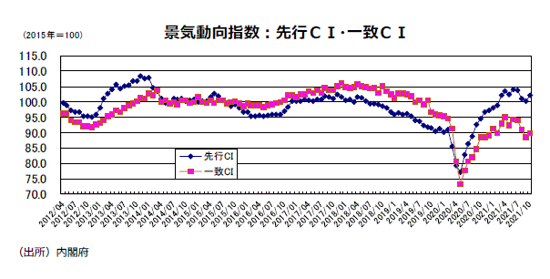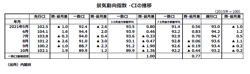 ●10月分の一致CIは前月差+1.2と4カ月ぶりの上昇になった。速報値からデータが利用可能な8系列では、生産指数、鉱工業生産財出荷指数、耐久消費財出荷指数、商業販売額指数・小売業、輸出数量指数の5系列が前月差プラス寄与度に、投資財出荷指数、商業販売額指数・卸売業、有効求人倍率の3系列が前月差マイナス寄与度になった。10月は、東南アジアでの新型コロナウイルス感染拡大に伴う部材供給不足の影響などが緩和されたことや、9月末まで発出されていた緊急事態宣言やまん延防止等重点措置が解除されたことがプラスに働いた。