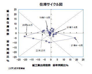 ●鉱工業全体の在庫循環の動きをチェックするために、縦軸に鉱工業在庫指数・前年比、横軸に鉱工業出荷指数・前年比をとった在庫サイクル図をつくると、20年7~9月期までは「在庫調整局面」の状態にあったが、20年10~12月期、21年1~3月期では「意図せざる在庫減局面」になっていた。4~6月期では在庫の前年同期比▲5.0%、出荷が前年の反動もあり、前年同期比+18.8%と2ケタの伸び率になり、「在庫積み増し局面」に入った。7~9月期では在庫が前年同期比+0.5%、出荷が前年同月比+4.2%の伸び率になり、引き続き「在庫積み増し局面」となっていた。10月分では在庫が前年同期比+2.4%、出荷が前年同月比▲6.1%の伸び率になり、「在庫調整局面」となっている。しかし、部材調達不足による生産の減少による影響が大きいなど特殊事情もあり、目先、動向を注視していくことが必要な局面だろう。