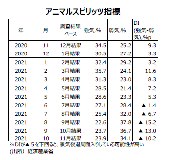 経済産業省が製造工業生産予測指数から作成しているアニマルスピリッツ指標は発表時期が約半月早まり、10月29日から鉱工業生産指数・速報値発表と同時に結果が発表されるようになった。21年6月調査結果で、アニマルスピリッツ指標(生産活動マインド指標:DI)は11カ月連続のプラスの数値となり、企業の生産マインドは強気の状況が続いていたが、7月~11月調査結果ではDIはマイナスになっている。11月調査結果のDIは▲10.2である。まだ、弱い数字だが、10月調査結果からは2.8ポイント改善した。これで2カ月連続改善となった。
