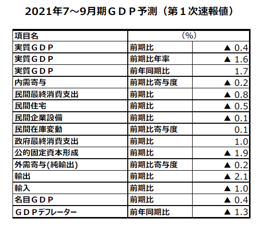 ●11月15日に発表される7~9月期第1次速報値では、実質GDP成長率は前期比▲0.4%程度、前期比年率▲1.6%程度と、新型コロナウイルス感染症拡大・緊急事態宣言発出などの影響で消費活動が抑制されたことや、輸出が供給制約の影響から弱い動きになったことから2四半期ぶりのマイナス成長になると予測する。
