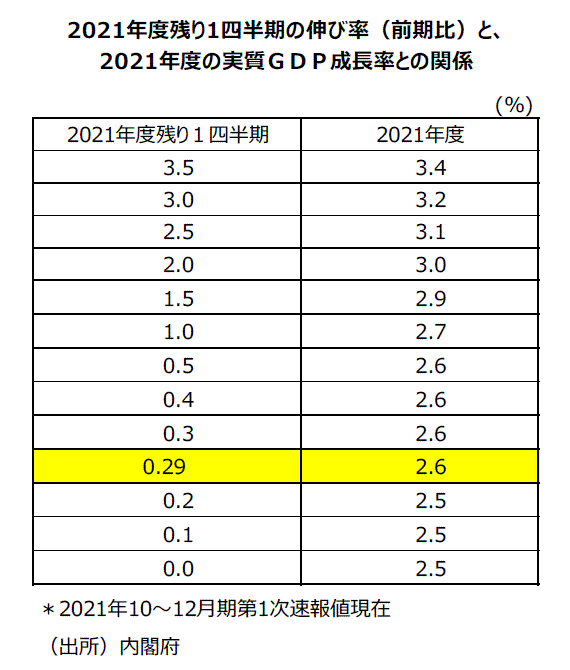 ●「令和4年度の内閣府年央試算」の21年度実質GDP成長率実績見込み・前年度比+2.6%を達成するには、21年度残り1四半期で前期比年率+1.2%(前期比+0.29%)が必要である。20年度から21年度へのゲタは+1.7%である。なお、21年度残り1四半期が前期比0.0%だと21年度実質GDP成長率・前年度比は+2.5%になる。