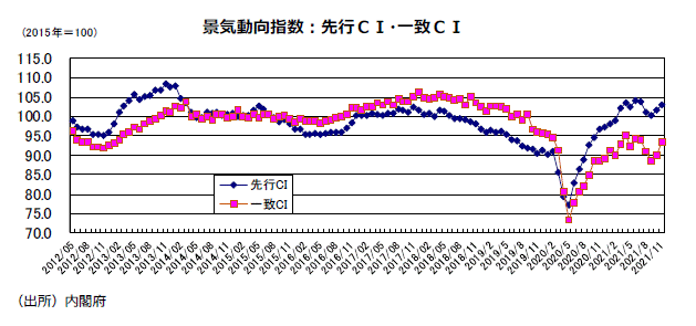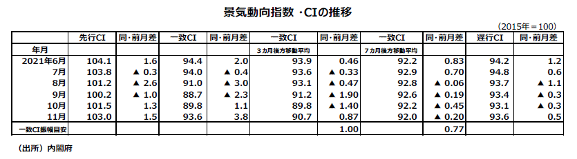 -先行CI前月差+1.5の2カ月連続の上昇、一致CI+3.8と2カ月連続の上昇-
