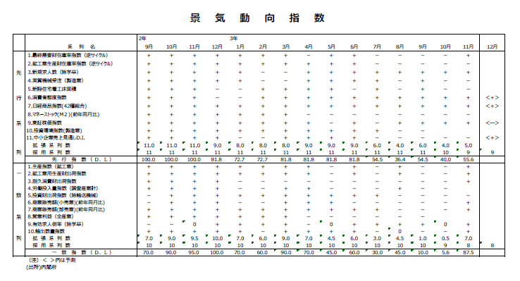 ●11月分の先行DIは55.6%と2カ月ぶりに景気判断の分岐点の50%を上回った。速報値からデータが利用可能な9系列中、最終需要財在庫率指数(逆サイクル) 、新規求人数、消費者態度指数、日経商品指数、東証株価指数の5系列がプラス符号に、鉱工業生産財在庫率指数(逆サイクル)、新設住宅着工床面積、マネーストック、中小企業売上げ見通しDIの4系列がマイナス符号になった。