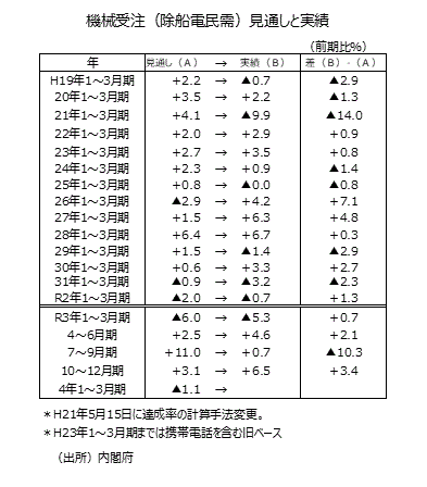 ●機械受注(除船電民需)の10~12月期は前期比+3.1%の見通しであったが、実績は前期比+6.5%と見通しを上回った。機械受注(除船電民需)の10~12月期・前期比実績は2009年(平成21年)から21年までの13年間でみると、上振れ9回、下振れ4回となり、上振れしやすい傾向が継続した。