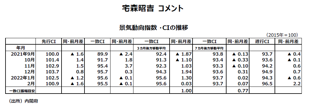 -2月分一致CIの3カ月移動平均4カ月連続上昇も、「足踏みを示している」継続-