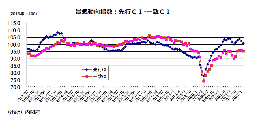 -先行CI前月差▲1.6で2カ月連続の下降、一致CI▲0.1で2カ月連続の下降-