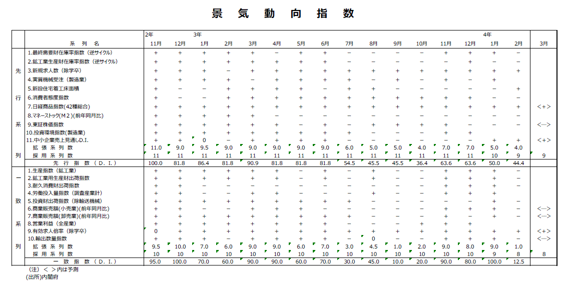 ●また、3月分の先行DIでは、数値が判明している日経商品指数、東証株価指数、中小企業売上げ見通しDIの3系列では、日経商品指数1系列がプラス符号に、東証株価指数、中小企業売上げ見通しDIの2系列がマイナス符号になることが判明している。3月分速報値段階の先行DIは11.1%以上77.8%以下になることが確定している。