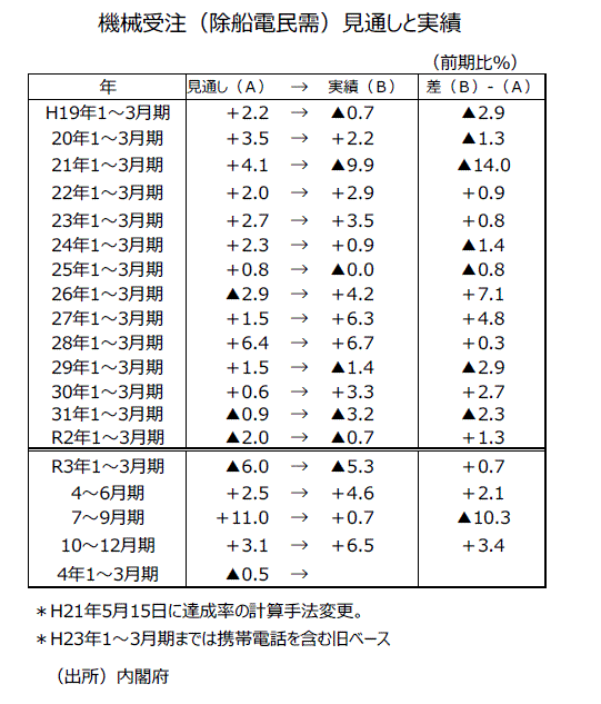 ●機械受注(除船電民需)1~3月期の前期比見通しは▲1.1%から季節調整替えの影響で▲0.5%に変更になった。新型コロナウイルス感染拡大・第6波などで、企業が設備投資に慎重になった影響が感じられる数字である。1~3月期の前期比実績は09年(平成21年)から21年までの13年間でみると、上振れ8回、下振れ5回であり、若干上振れしやすい傾向がある四半期である。22年(令和4年)の見通しは単純集計値に過去3四半期平均の達成率95.1%をかけたものである。1~3月期の前期比見通しの▲0.5%を達成するためには、3月の前月比が+17.4%になる必要があり、下振れる可能性の方が大きいと思われる。3月分が前月比0.0%なら1~3月期の前期比は▲5.8%になる。