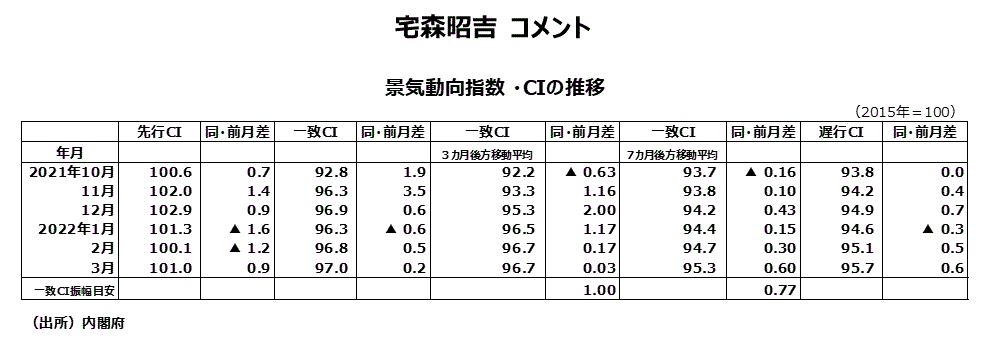 -3月分一致CIの3カ月移動平均5カ月連続上昇、2カ月連続で「改善」の判断-