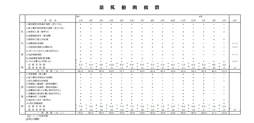 ●また、4月分の先行DIでは、数値が判明している消費者態度指数、日経商品指数、東証株価指数、中小企業売上げ見通しDIの4系列では、中小企業売上げ見通しDI1系列がプラス符号に、消費者態度指数、日経商品指数、東証株価指数の3系列がマイナス符号になることが判明している。4月分速報値段階の先行DIは11.1%以上66.7%以下になることが確定している。