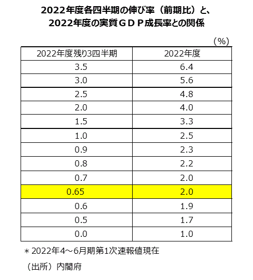●「令和4年度の内閣府年央試算」の22年度実質GDP成長率・前年度比+2.0%を達成するには、22年度残り3四半期で各々前期比年率+2.6%(前期比+0.65%)が必要である。21年度から22年度へのゲタは+0.4%だ。なお、22年度各四半期が前期比0.0%ずつだと22年度実質GDP成長率・前年度比は+1.0%に、前期比+0.5%ずつだと22年度実質GDP成長率・前年度比は+1.7%になる。