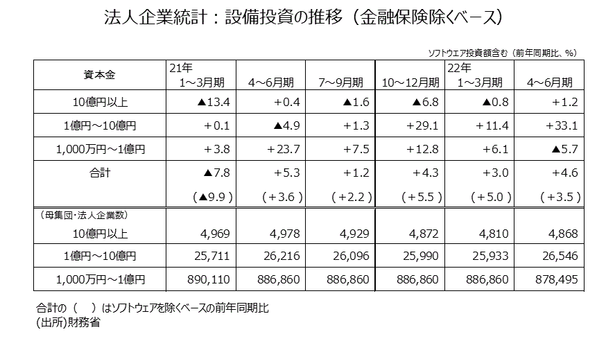 法人企業統計(ソフトウェア投資額を含むベース)で4~6月期の全産業の前年同期比は+4.6%で1~3月期の+3.0%と比べ1.6ポイント伸び率が改善した。資本金別の内訳をみるとまちまちで、資本金10億円以上の大企業では前年同期比は+1.2%の増加と、1~3月期の▲0.8%の減少から2.0ポイント改善した。また、資本金1億円以上10億円未満の前年同期比は+33.1%の増加と、1~3月期の+11.4%の増加から21.7ポイント改善した。一方、資本金1,000万円以上1億円未満の中小企業の前年同期比は▲5.7%の減少と、1~3月期の前年同期比+6.1%からは11.8ポイント悪化した。