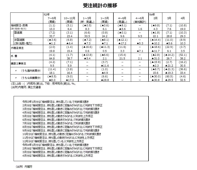 ●内閣府の基調判断の推移をみると、21年8月分で「持ち直しの動きに足踏みがみられる」に判断が下方修正された。9月分・10月分では「持ち直しの動きに足踏みがみられる」に判断が据え置かれた。11月分では「持ち直しの動きがみられる」に、さらに12月分では「持ち直している」に上方修正され、22年1月分では判断据え置きとなっていた。しかし、2月分では「持ち直しの動きに足踏みがみられる」に判断が下方修正され、前回3月分でも前月比は増加に転じたものの、3カ月移動平均の前月比が減少であることなどから、判断据え置きになったようだ。今回4月分では、3カ月移動平均の前月比が3カ月ぶりに増加したことなどで「持ち直しの動きがみられる」に判断が4カ月ぶりに上方修正された。