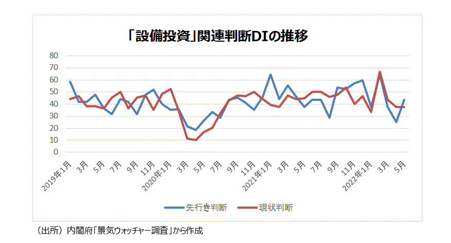 ●景気ウォッチャー調査の設備投資関連・現状判断DIは、21年11月40.0(回答した景気ウォッチャー・5人)、12月46.9(同8人)、22年1月33.3(同3人)、2月64.3(同7人)、3月43.8(同8人)、4月37.5(同4人)、5月37.5(同6人)と推移している。5月では「各企業共に、大型設備投資には慎重であり、3カ月前と比較し大きく変動はない。(九州:その他サービス業[物品リース](職員))」というコメントがあった。