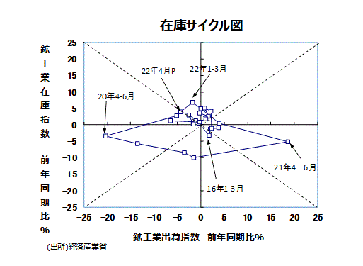 ●鉱工業全体の在庫循環の動きをチェックするために、縦軸に鉱工業在庫指数・前年比、横軸に鉱工業出荷指数・前年比をとった在庫サイクル図をつくると、20年10~12月期、21年1~3月期では「意図せざる在庫減局面」になっていた。4~6月期では「在庫積み増し局面」に入った。7~9月期では引き続き「在庫積み増し局面」となった。10~12月分では在庫が前年同期比+4.9%、出荷が前年同月比0.0%の伸び率になり、「在庫積み上がり局面」となった。21年1~3月期では在庫が前年同期比+6.8%、出荷が前年同月比▲1.8%の伸び率で引き続き「在庫積み上がり局面」となっていた。今回4月分速報値では在庫が前年同月比+3.9%、出荷が前年同月比▲4.3%の伸び率で、ぎりぎり「在庫調整局面」となった。しかし、部材調達不足などによる生産の減少による影響が含まれていることなどから、もうしばらく動向を注視していくことが必要な局面であろう。