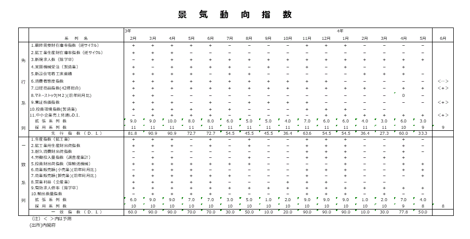 ●また、6月分の先行DIでは、数値が判明している消費者態度指数、日経商品指数、東証株価指数、中小企業売上げ見通しDIの4系列では、日経商品指数、東証株価指数数、中小企業売上げ見通しDIの3系列がプラス符号に、消費者態度指数1系列がマイナス符号になることが判明している。5月分速報値段階の先行DIは33.3%以上88.9%以下になることが確定している。